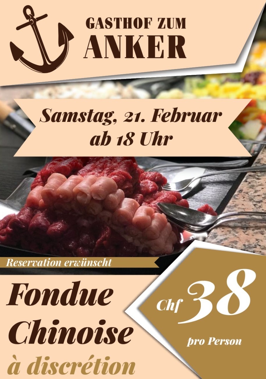 Geniessen Sie einen gemütlichen Abend im Gasthof zum Anker! Wir laden Sie ein zu unserem Fondue-Chinoise-Abend mit einer vielfältigen Auswahl und gemütlichem Ambiente für nur CHF 38,. pro Person.